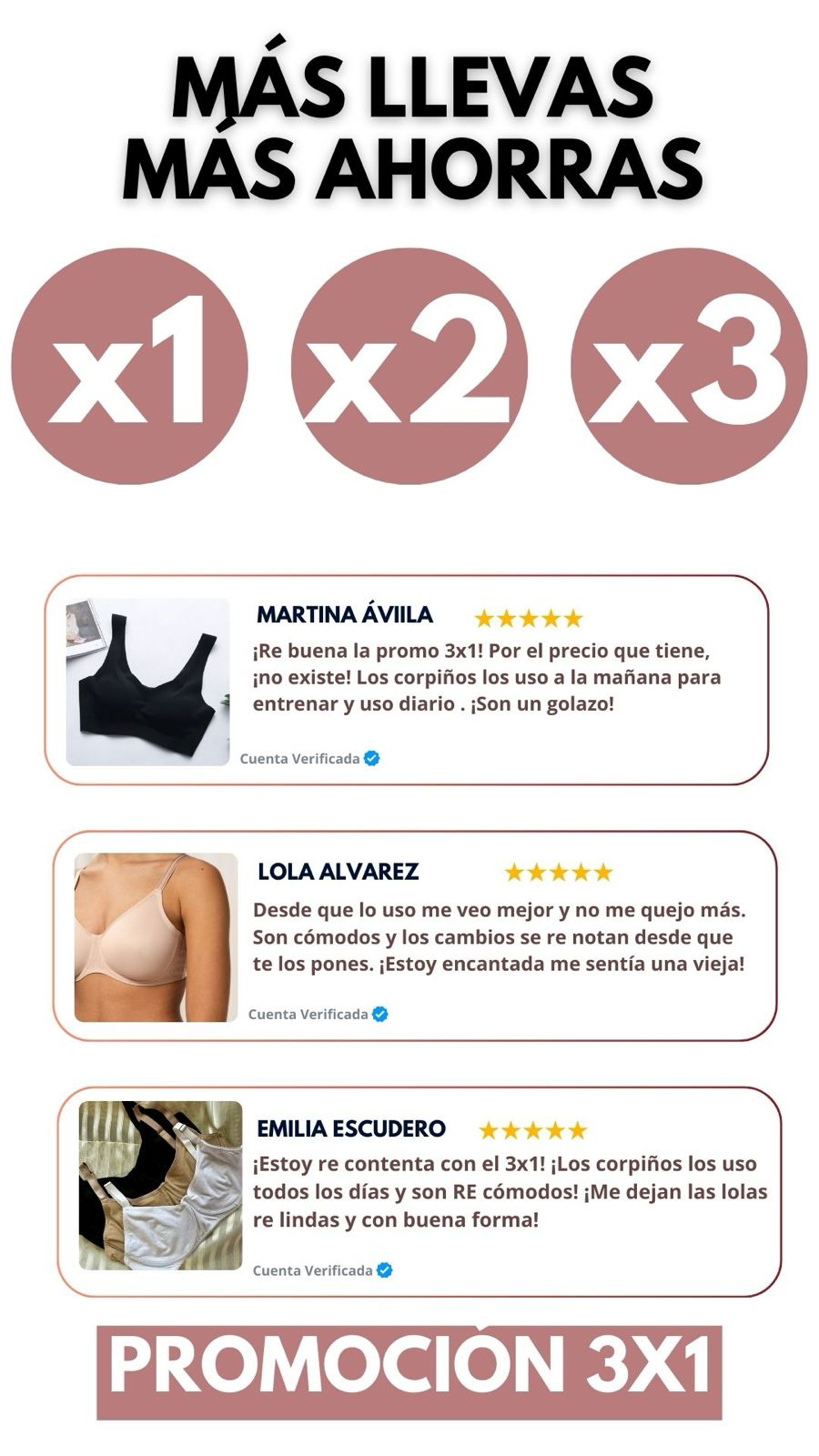 “¡3 por 1 y encima buenísimos!” Pensé que iba a ser medio trucho por la promo, pero nada que ver. Son suaves, se adaptan re bien y me dejan el busto hermoso. Mi hermana ya me pidió el link.